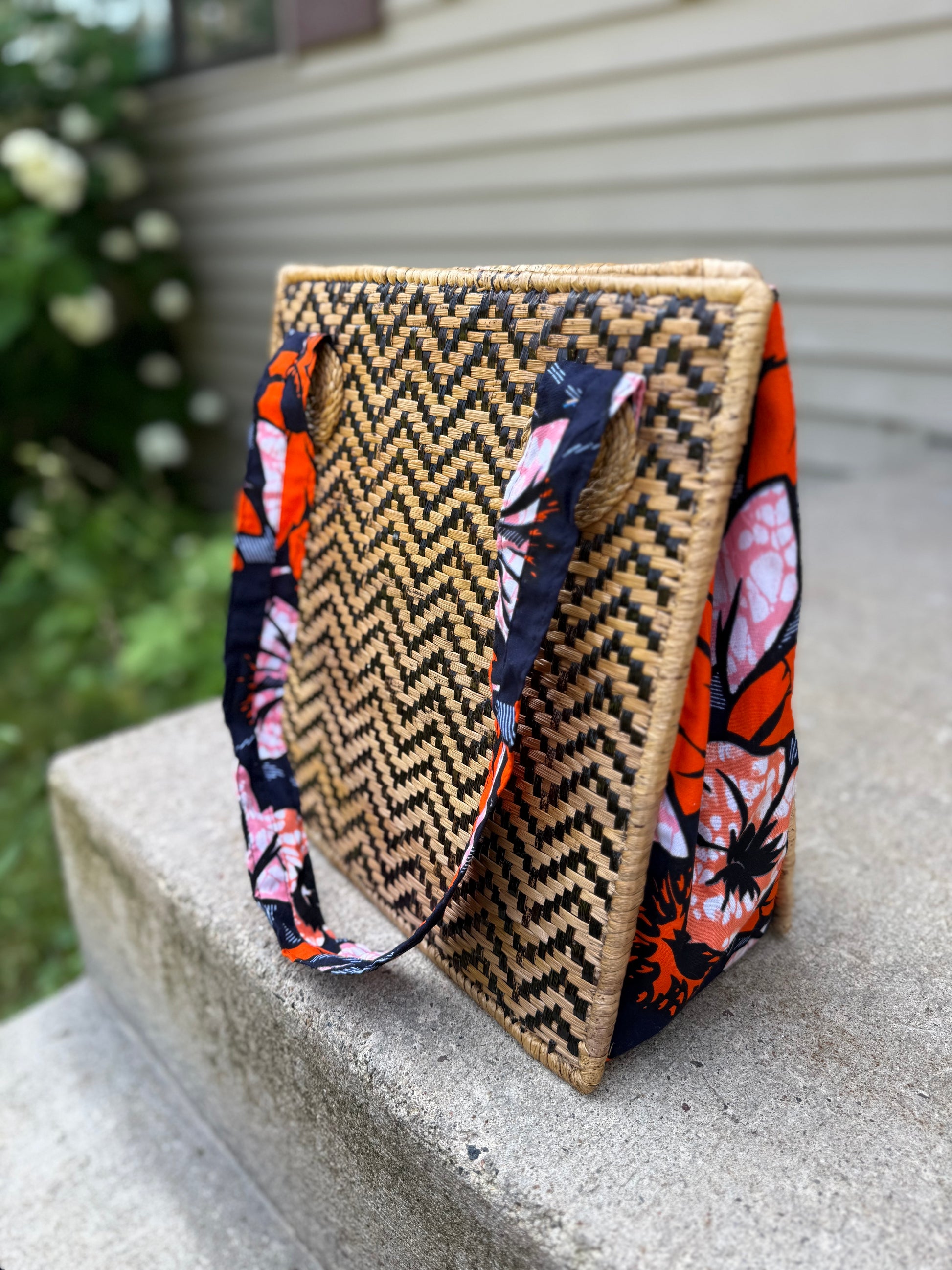Artisans use upcycled banana fibers to create woven panels, then add kitenge market fabric to create this bag. Your bag will arrive to you flat, but when you place the bottom banana panel, POP- the bag comes to life. The Banana Panel Pop-Up bag is very lightweight but sturdy. The combination of the natural banana leaf and colorful market fabric is fun and beautiful.