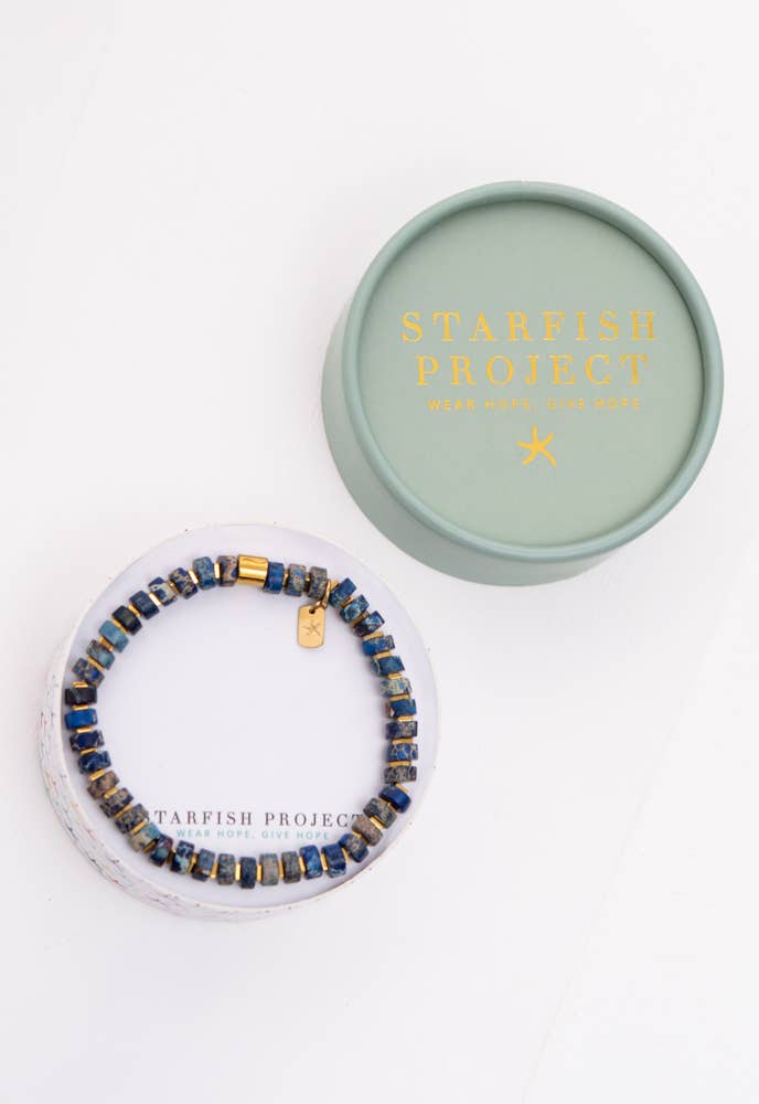 Made to add to your stack, yet a perfect outfit-accenting pop of rich color worn alone. The vibrant blue emperor stone paired with hematite beads makes a gorgeous statement. Your purchase of the Emperor Blue Beaded Bracelet restores hope to women and girls escaping human trafficking and exploitation. Double your impact by pairing this eye-catching bracelet with another vibrant hue- Scarlet Red Beaded Bracelet. Box size and color may vary.