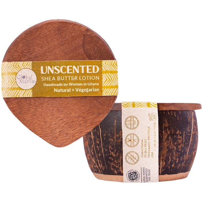 Unscented shea butter has natural, therapeutic properties that moisturize and restore the natural beauty of the skin. Handmade in Ghana. Packaged in repurposed coconut shell containers made in Ghana.