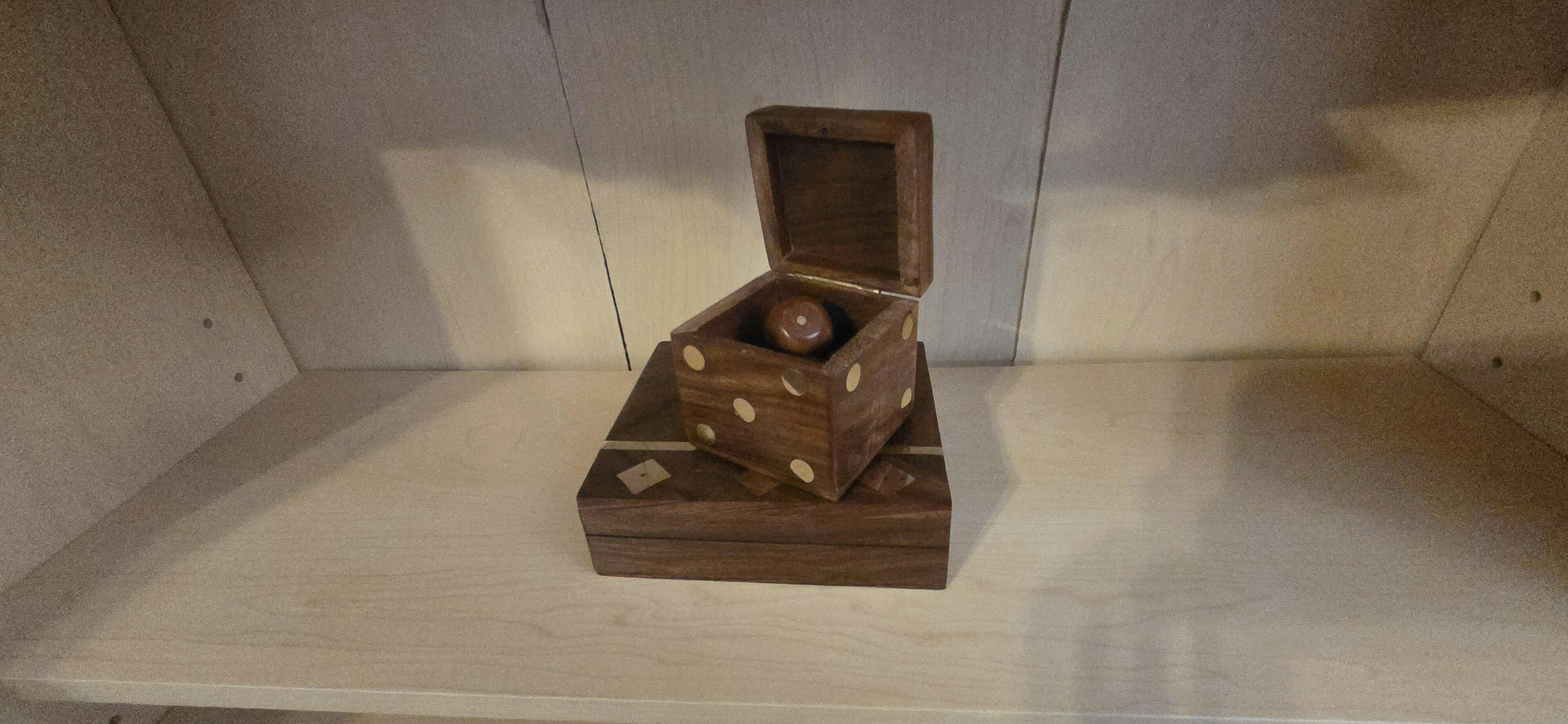 Enjoy hours of game night fun and entertaining with this small wooden box, hand-carved from Indian Rosewood and shaped and made to look like a large die containing five small wooden dice with gold painted dots. Great home decor addition to any coffee table or desk or to take along on your travels, in the car or plane! Versatile gender neutral, unisex gift for yourself or a loved one for birthdays, wedding gifts, showers and registry, gifts for mom or dad and graduations! CHOKING HAZARD - Small parts. Not for children under 3 yrs.