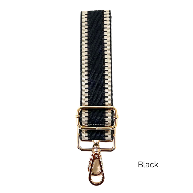 Strap features: - A jacquard weave allows the pattern to be woven into the strap - Brass hardware - Adjustable length. Can be worn short as a shoulder strap, or long as a crossbody strap. - 1.5” width. 54 inches long. - Can be used on any handbag with D or O rings