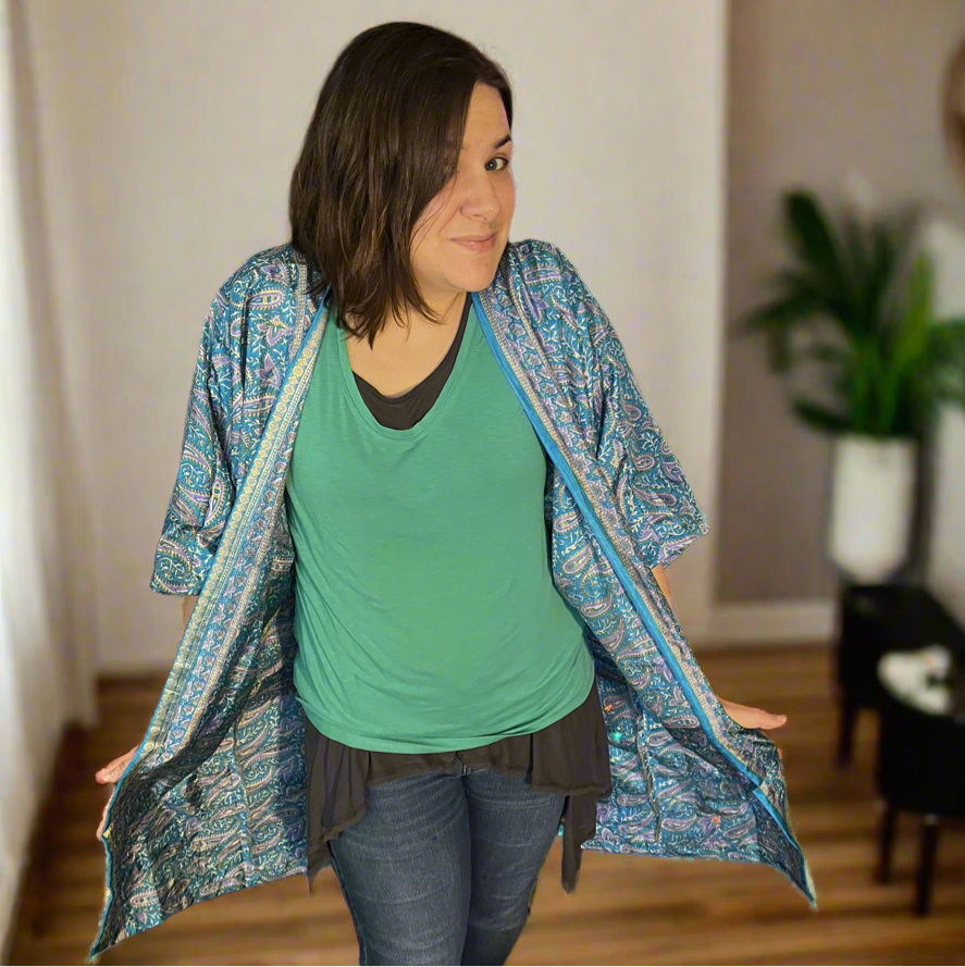 The Marilyn Silk Sari Duster is a soft, flowy statement piece that complements any style! Made from recycled materials, this eco-friendly duster adds a light and stylish layer, perfect for those days when you want to look effortlessly chic while caring for the planet. Each duster is crafted from 100% reclaimed sari fabric, sourced in India, giving it a one-of-a-kind story. Hand-selected by the DGY team, no two dusters are exactly the same, making yours truly unique. Be sure to check the sizing below before ordering. You can also share color preferences in the order comments, but note that availability is limited, so we can't guarantee specific colors.