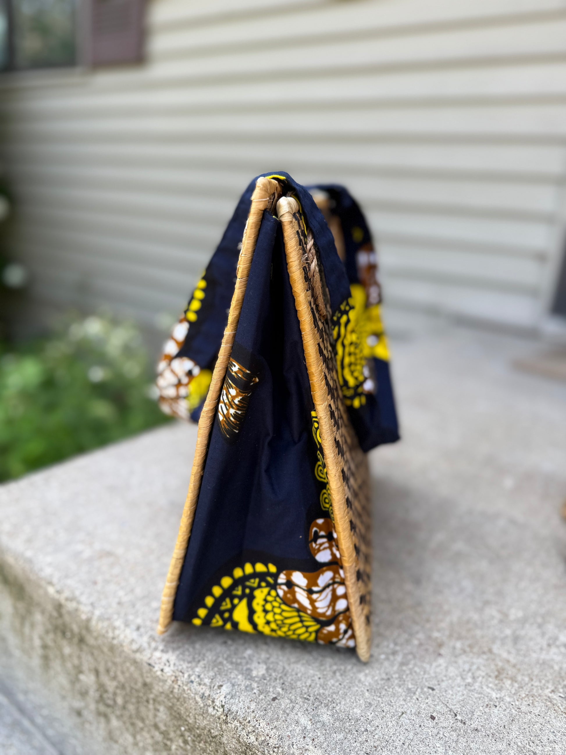 Limited Inventory!! Artisans use upcycled banana fibers to create woven panels, then add kitenge market fabric to create this bag. Your bag will arrive to you flat, but when you place the bottom banana panel, POP- the bag comes to life. The Banana Panel Pop-Up bag is very lightweight but sturdy. The combination of the natural banana leaf and colorful market fabric is fun and beautiful.