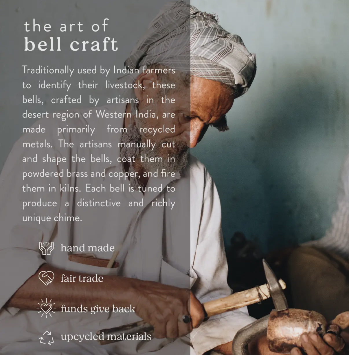 Our Bird Bell Chime incorporates age-old bell making techniques in modern, versatile designs featuring metal bells. Bell making is a traditional artform passed down for generations in the desert Kutch region of India. This lightweight wind chime features a bird design finished with a wooden bead accent and convenient jute hanging loop.