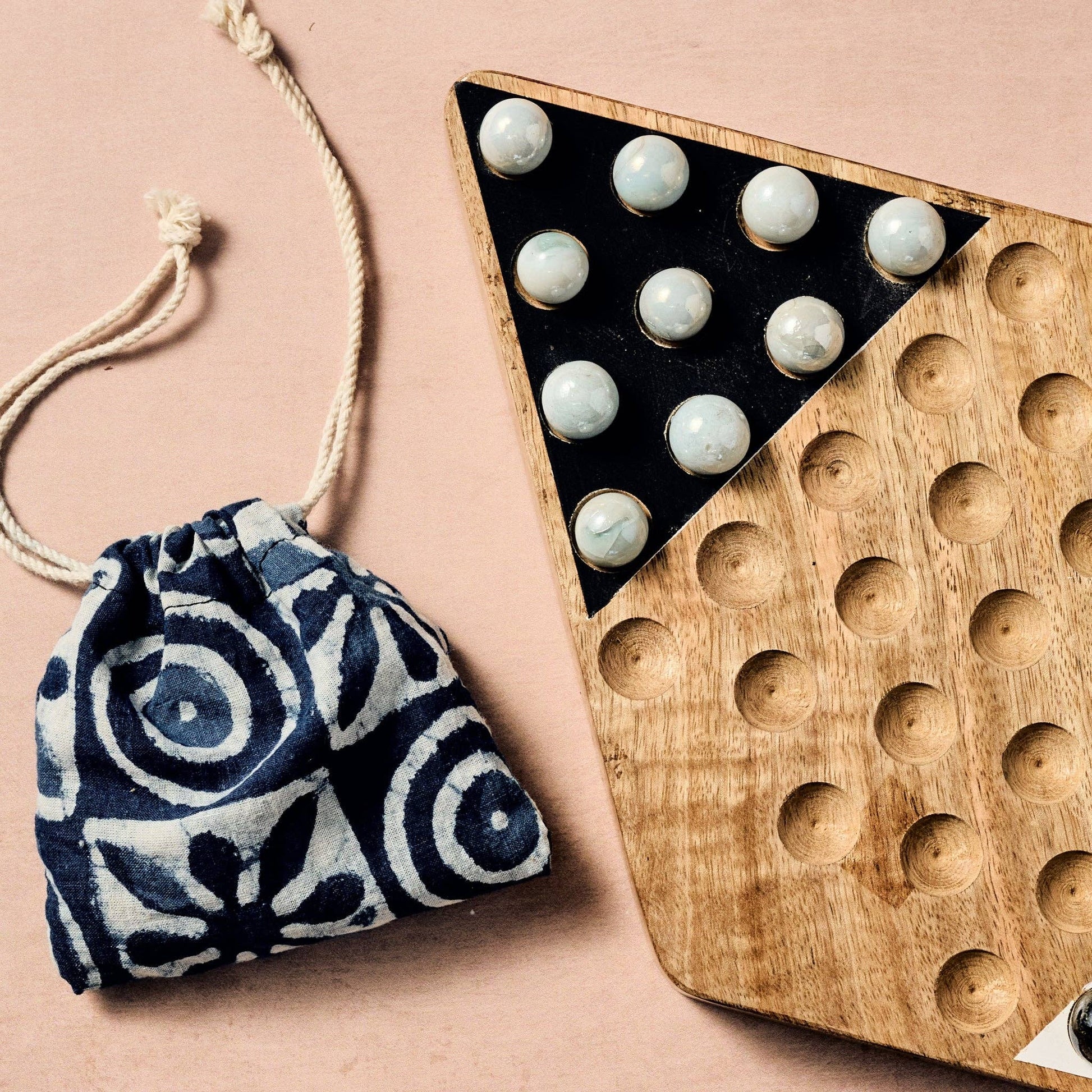 Masterfully crafted from mango wood and designed for two players, this double-sided Chinese Checkers set brings strategy and style to your tabletop. Lightly burnt edges add rustic charm to the diamond-shaped board, with carved marble rests for smooth gameplay. Comes with 10 black and 10 white glass marbles and a unique pouch made from recycled cotton. Add an artistic vibe to game nights or proudly gift to your favorite boardgame enthusiast! Handcrafted in India.