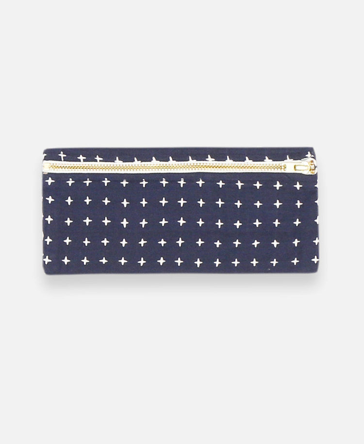 LIMITED QUANTITY. Our modern pencil cases are designed to keep your sunglasses, pencils, chargers and other every day necessities in one convenient place. Handmade from organic cotton, this charming pouch features a gold-tone zipper accented with tiny cross-stitch detailing against a fun, colorful background.
