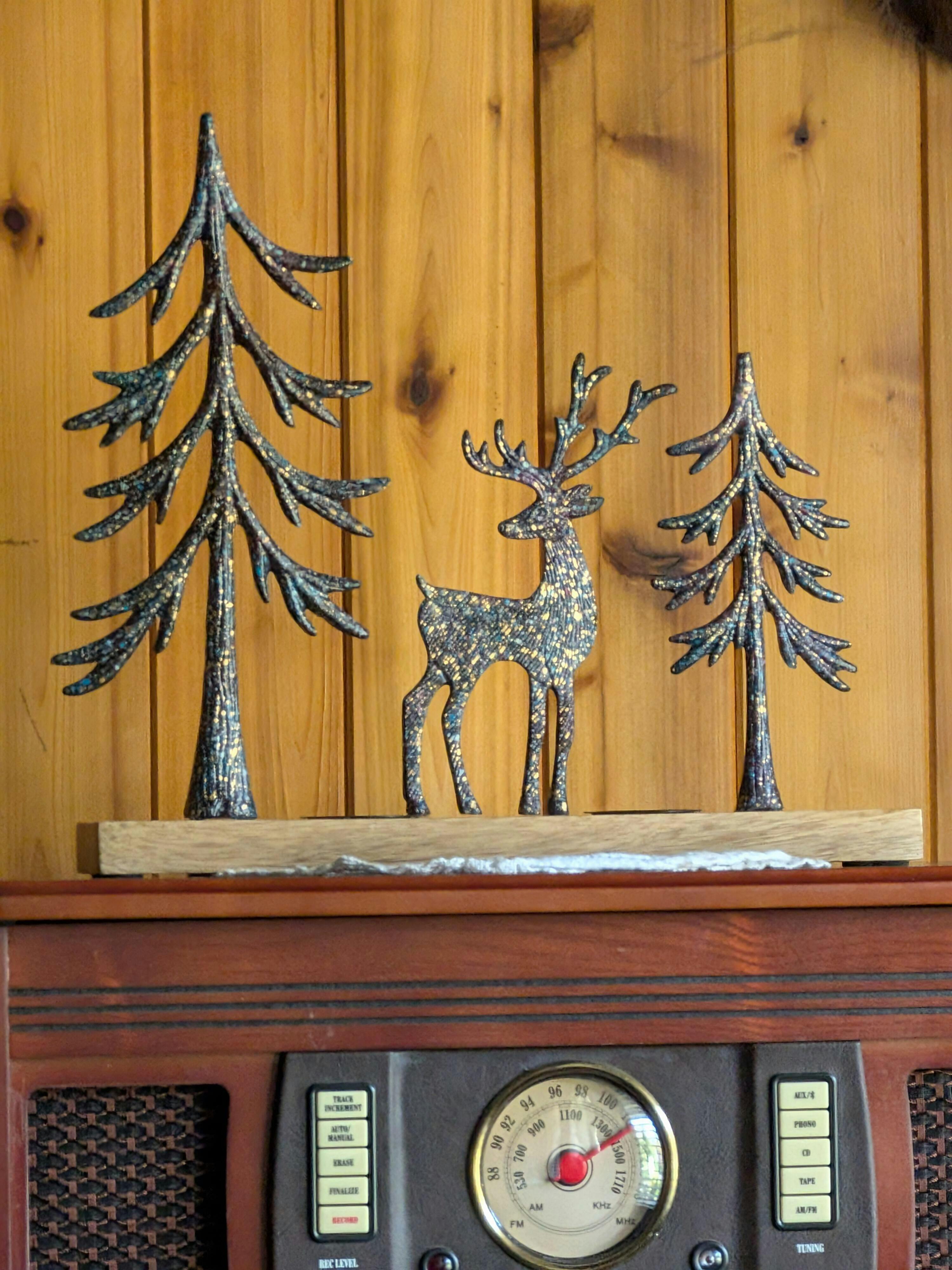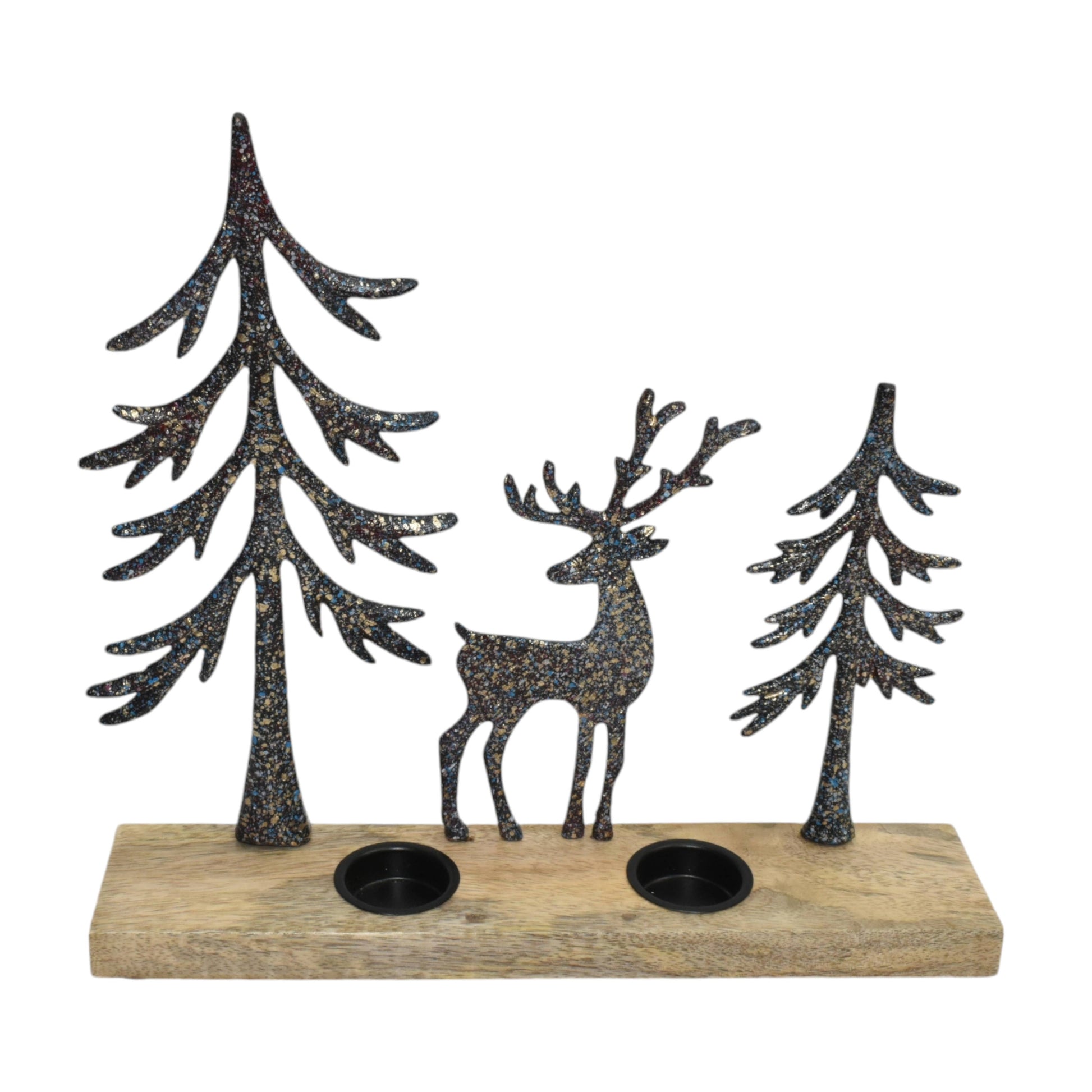 Bring the magic of the holiday season into your home with this enchanting Iron Tea Light Holder. Crafted with rustic elegance, this piece features a majestic reindeer gracefully poised between two slender trees, creating a serene forest scene. When lit, the two round candle holders integrated into the sturdy wooden base cast a soft, warm glow, bringing the scene to life and creating a cozy atmosphere. Perfect for your mantel, as a centerpiece, or anywhere you want to add a festive touch, this Tea light holder is sure to be a conversation starter and a beloved addition to your holiday decor. Celebrate the season with this charming piece that combines artistry and functionality, making your home feel warm and inviting.