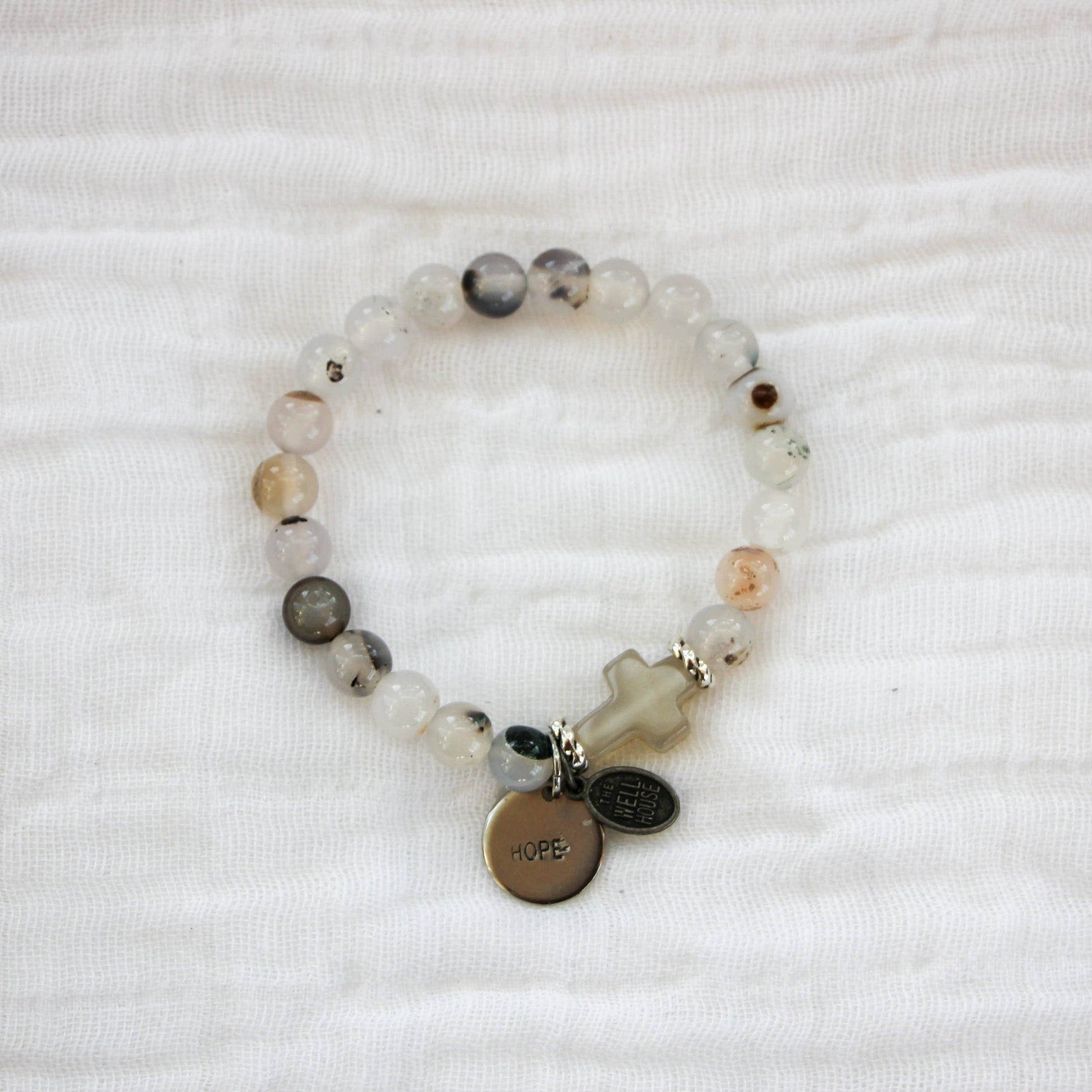 Handmade by survivor-artisans, the beaded Hope Bracelet features agate clear stone marbled beads, agate cross and HOPE stamped pendant. Handcrafted by a survivor of human trafficking, this exclusive piece encourages healing and restoration at The WellHouse.