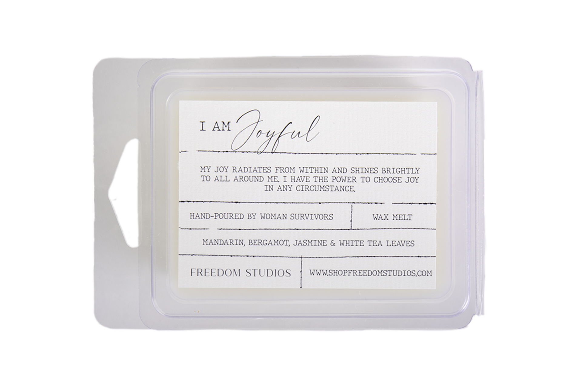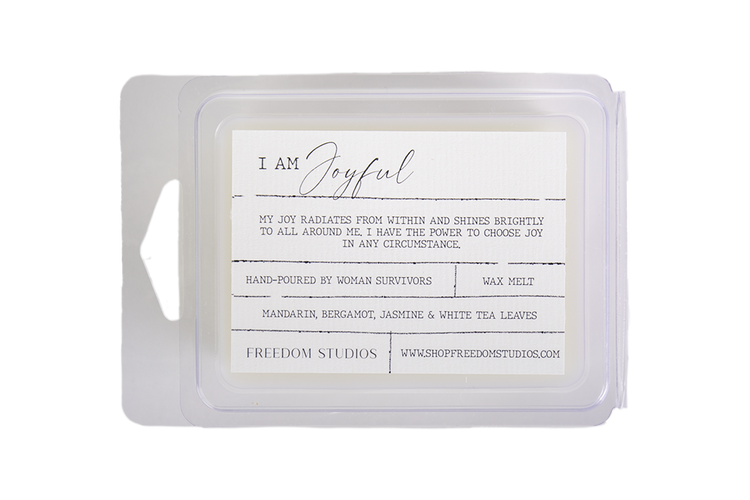 Create an atmosphere of joy with notes of mandarin, bergamot, jasmine & white tea leaves. This 2oz wax melt is made with soy blend wax, phthalate free fragrances and is hand poured by women survivors. I AM Joyful "My joy radiates from within and shines brightly to all around me. I have the power to choose joy in any circumstance."