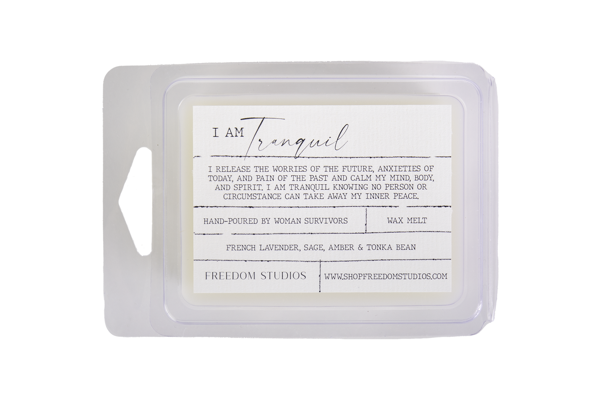 Create an atmosphere of peace and tranquility with notes of french lavender, sage, amber & tonka bean. This 2 oz wax melt is made with soy blend wax, highest quality fragrance oils, and is hand poured by women survivors. I AM Tranquil "I release the worries of the future, anxieties of today, and pain of the past and calm my mind, body, and spirit. I am tranquil knowing no person or circumstance an take away my inner peace."