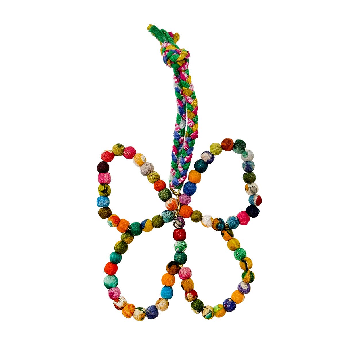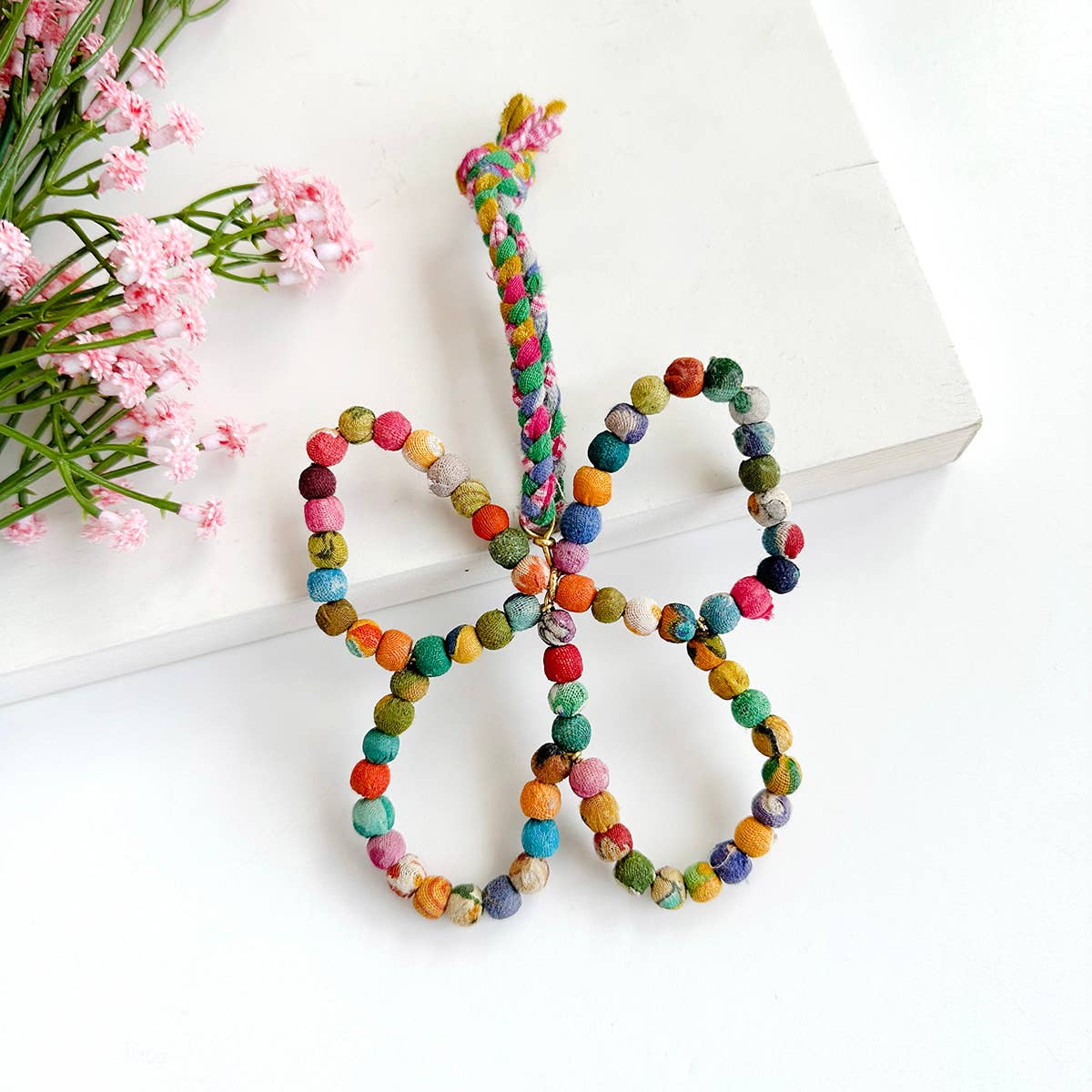 LIMITED QUANTITY. The butterfly has long been a symbol of transformation—and this piece carries that meaning in every detail. Made from repurposed sari fabric and Kantha beads, each Kantha Butterfly reflects new life: in the materials themselves, and in the life of the artisan who handcrafted it. Finished with a braided sari loop and set on a sturdy metal base, it’s a beautiful reminder that beauty can rise from what was once discarded.