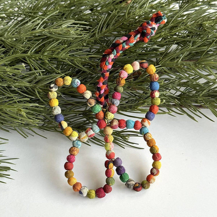 Measures 3" across and 4 " tall, with a 3” loop drop. Colors & patterns will vary due to repurposed textiles. Sustainably handmade by women artisans in India.