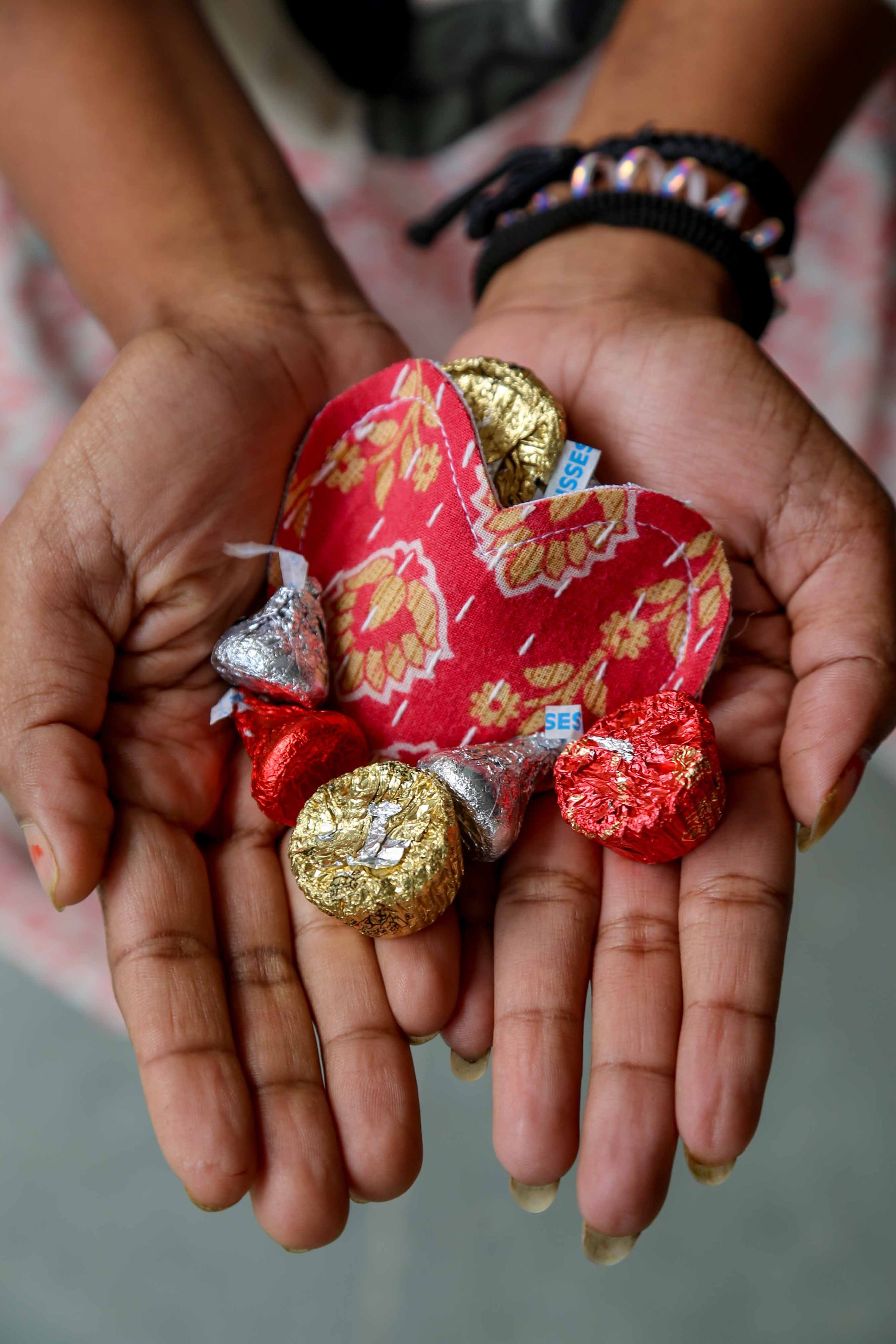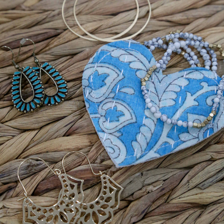 Wrap special little gifts for your loved ones in a handmade heart, made with love and impact! Your beautiful hand-stitched Kantha Heart Gift Pouch went through the hands of 2 different women and provides approximately 1 hour of work!