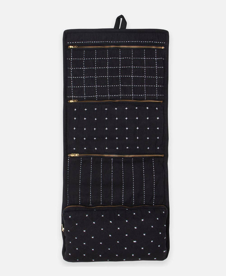 • Featuring: 4 zippered compartments, loop & tie for hanging & folding