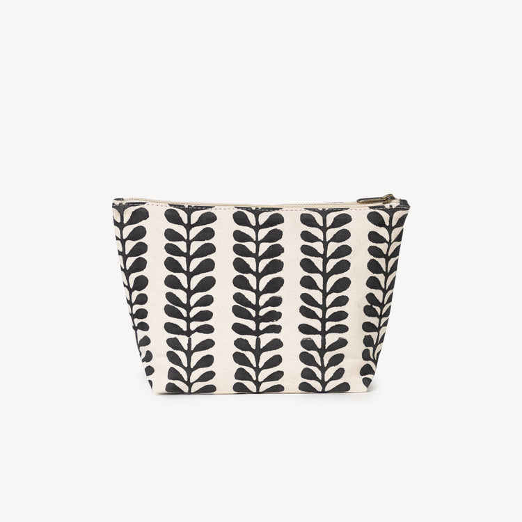 Hand block printed canvas with a waterproof interior, our large pouch works perfectly for both weekends away or the daily commute. In a generous size that carries everything from your skincare to your charging cables while tucking neatly inside our larger totes.