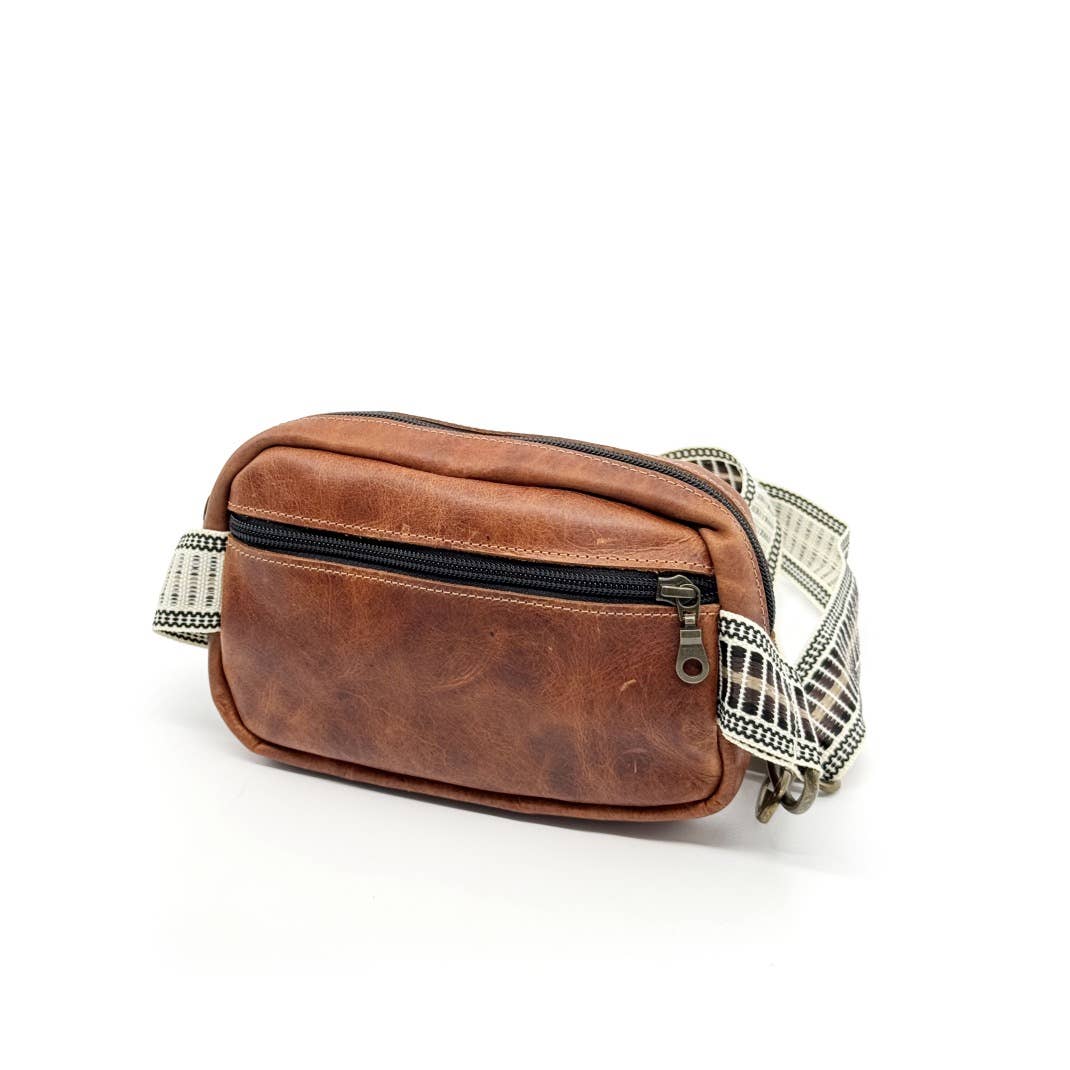 Designed for hands-free ease and everyday adventure, this artisan-crafted belt bag combines classic craftsmanship with practical design. Made from rich, vegetable-tanned leather, it features a sleek front slip pocket, a spacious main compartment with zip closure, and a secure zippered pocket on the back for storing valuables close. The standout feature? An adjustable, woven strap in stunning neutrals—adding a bold and meaningful touch to this versatile accessory.