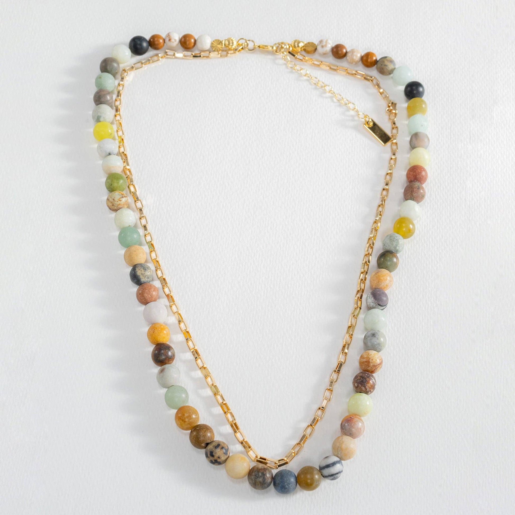 This necklace includes ivory jasper, amazonite stone, and brown jasper beads paired with a gold-plated rectangle chain. The gold-plated clasp closure and extender chain allow you to adjust the length for the best fit. A beautiful blend of natural beads makes it easy to mix and match with all your favorite Autumn colors. How could you not add the Patricia Necklace to your wardrobe?