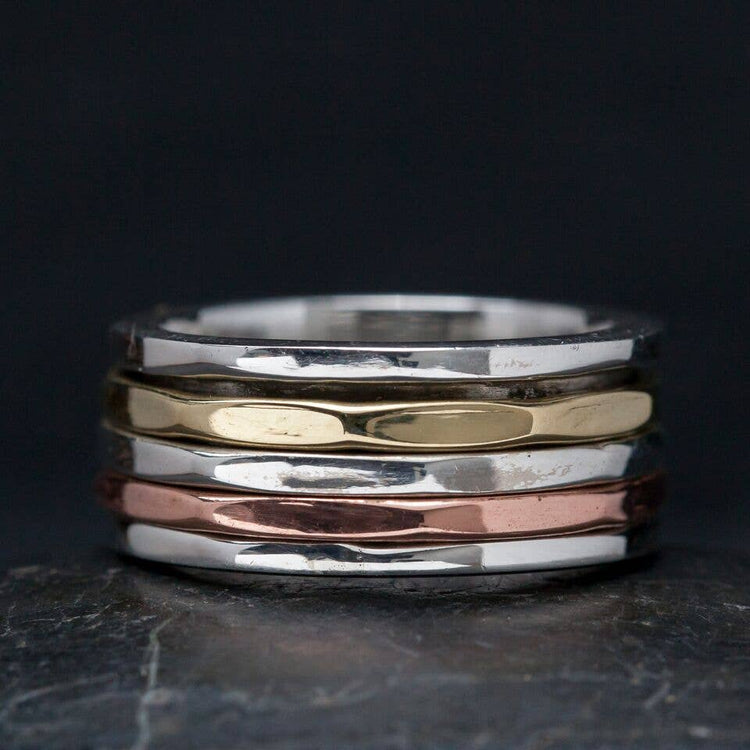 Simple sterling silver spinner ring with three hammered mixed metal bands. Our spinner rings are handmade with sterling silver and natural stones by silversmith artisans in Rajasthan, India. If you are anxious or prone to fidgeting, this ring is for you! comes in SIX sizes.