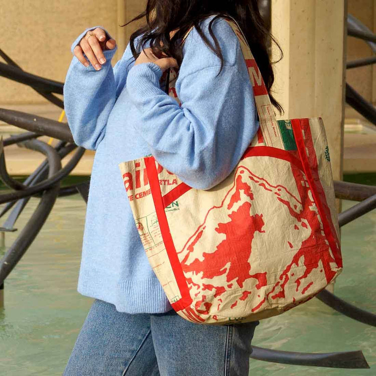 Print may vary! Each bag is one of a kind! Recycled Cement Bag Shoulder Strap Red Cotton Lining 2 Inside Pockets 1 Inside Zipper Pocket 12.75" L x 6.25" W x 15" H