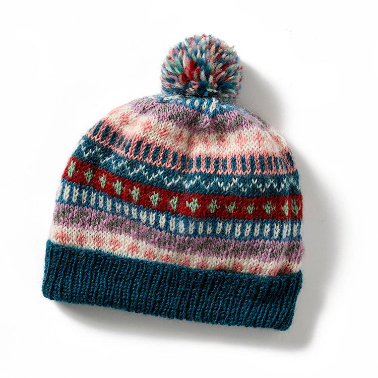 Keep toasty in a fair trade knit hat! This fleece-lined hand knitted hat features a Nordic pattern and pom pom in multicolor shades with dark blue band. Pair with the matching Nordic Knit Mittens for a coordinated look! Colors may vary slightly.