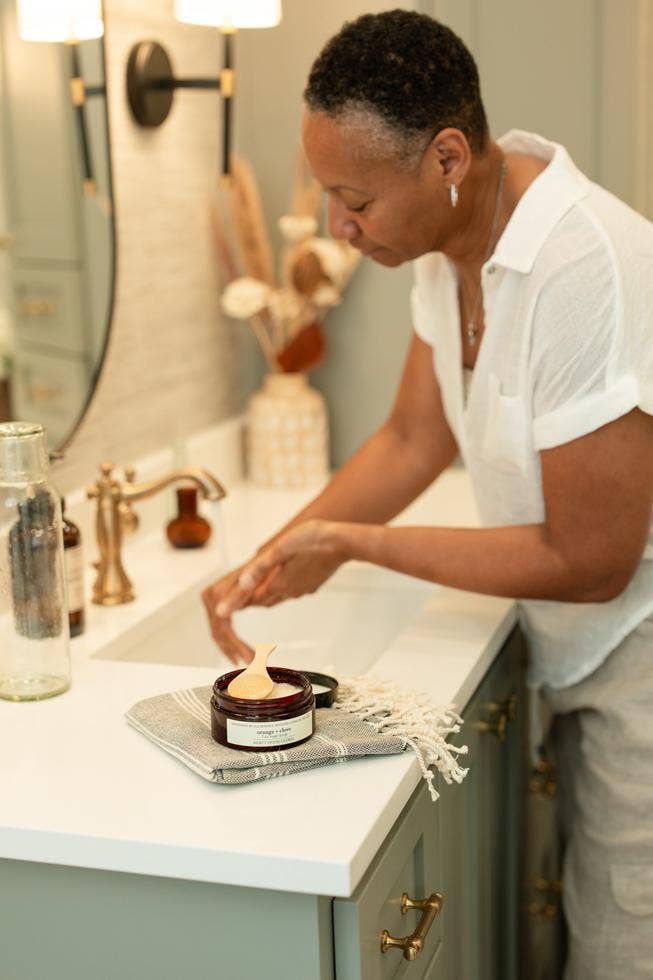 Treat your skin to a spa-like glow with our Orange + Clove Sugar Scrub. This 7oz exfoliant, infused with invigorating essential oils, gently buffs away dry skin while leaving behind a silky, moisturized finish. Housed in a charming apothecary jar and paired with a sustainable bamboo scoop, it’s a beautiful and eco-conscious addition to your self-care ritual.
