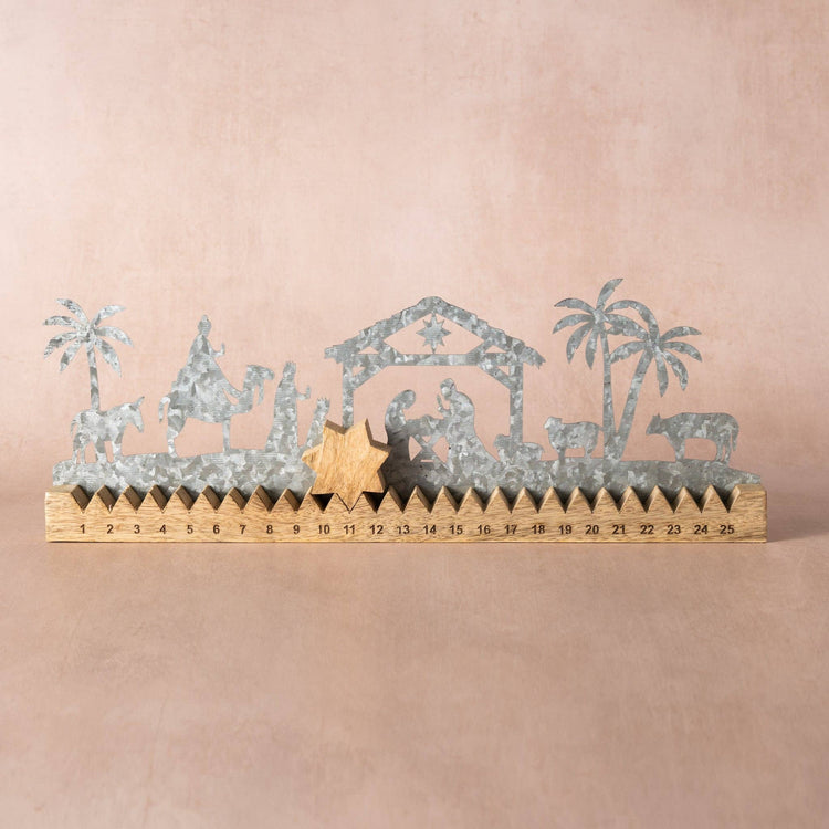 Celebrate the season with this beautifully designed Advent calendar. A mango wood base features numbers 1–25 and a movable star to mark each day. A galvanized metal nativity scene rises in silhouette behind the countdown, blending rustic charm with spiritual tradition. The contrast of natural wood and cool metal gives this piece a timeless look that suits any mantel or tabletop display. A thoughtful gift or heirloom in the making.