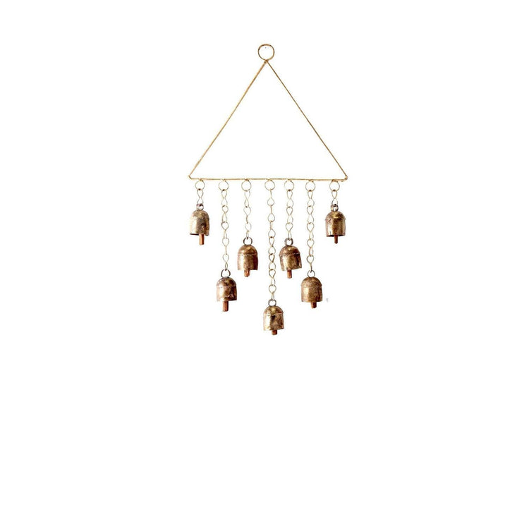 The Triangle Bell Wind Chime incorporates age-old bell making techniques in modern, versatile designs featuring shiny, copper finish Indian bells handcrafted with metal. Traditionally used by Indian farmers to identify their livestock, each bell is tuned to produce a distinctive chime. Made from recycled metals, artisans in the desert Kutch region manually cut and hammer the metal to hand-shape the bells, then coat them in powdered brass and copper before firing in kilns. Each rustic bell is then tuned to reveal a rich, unique sound like no other bell.