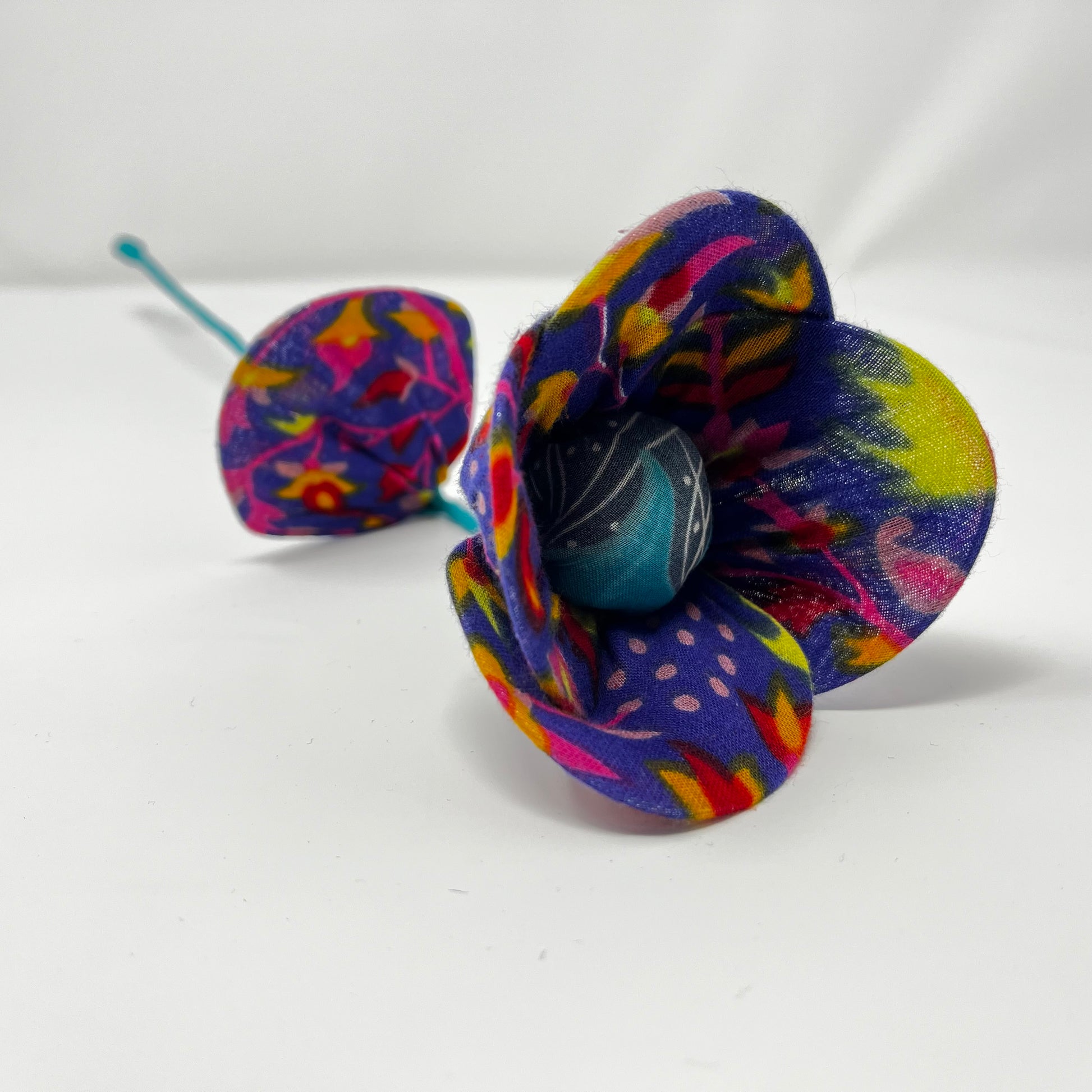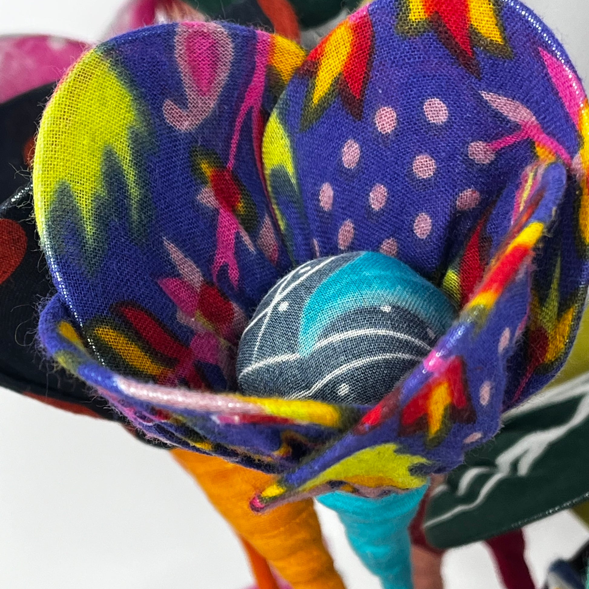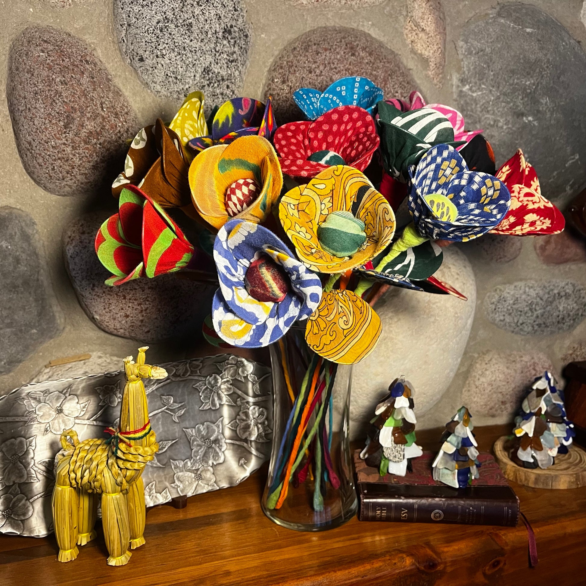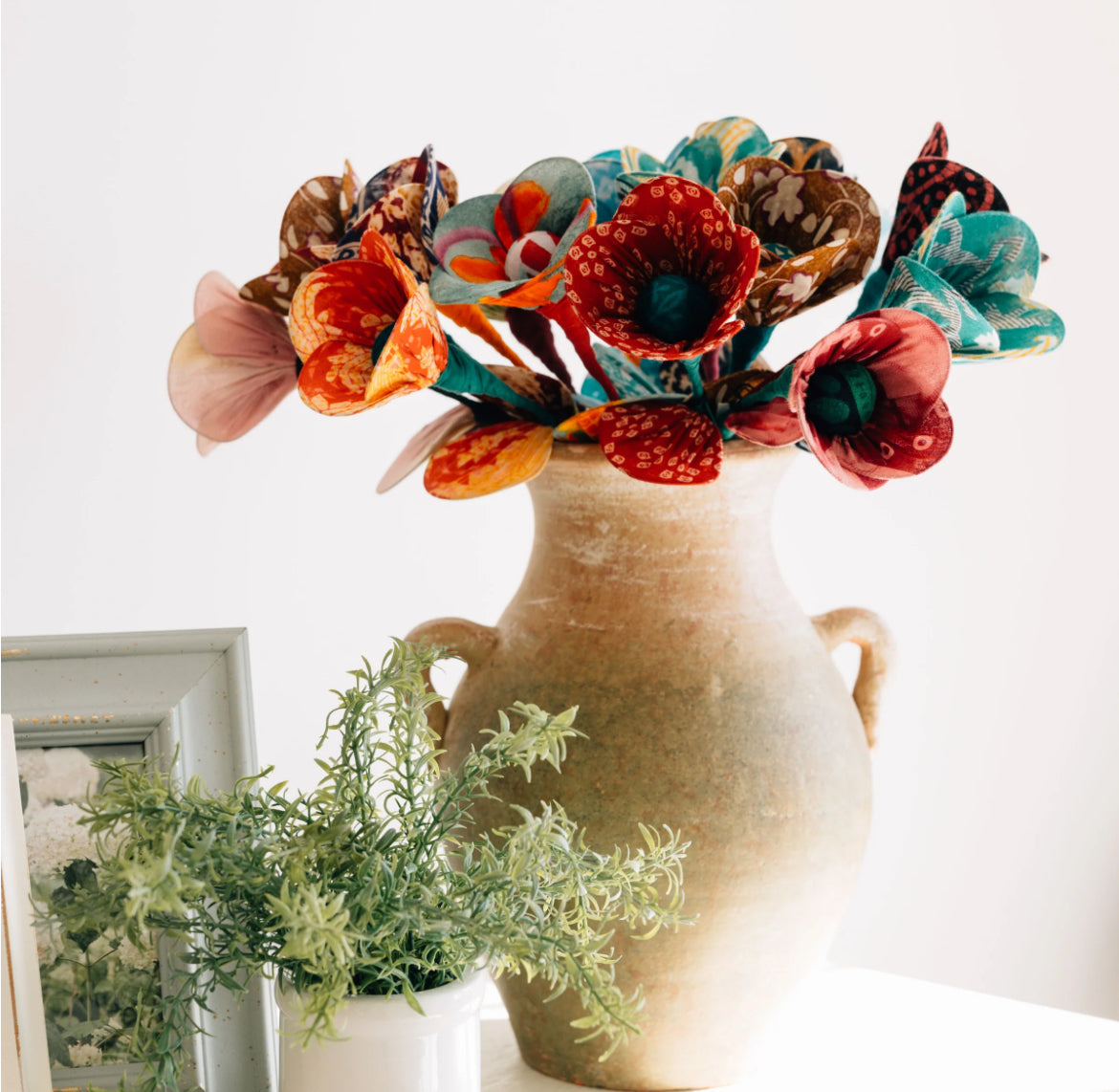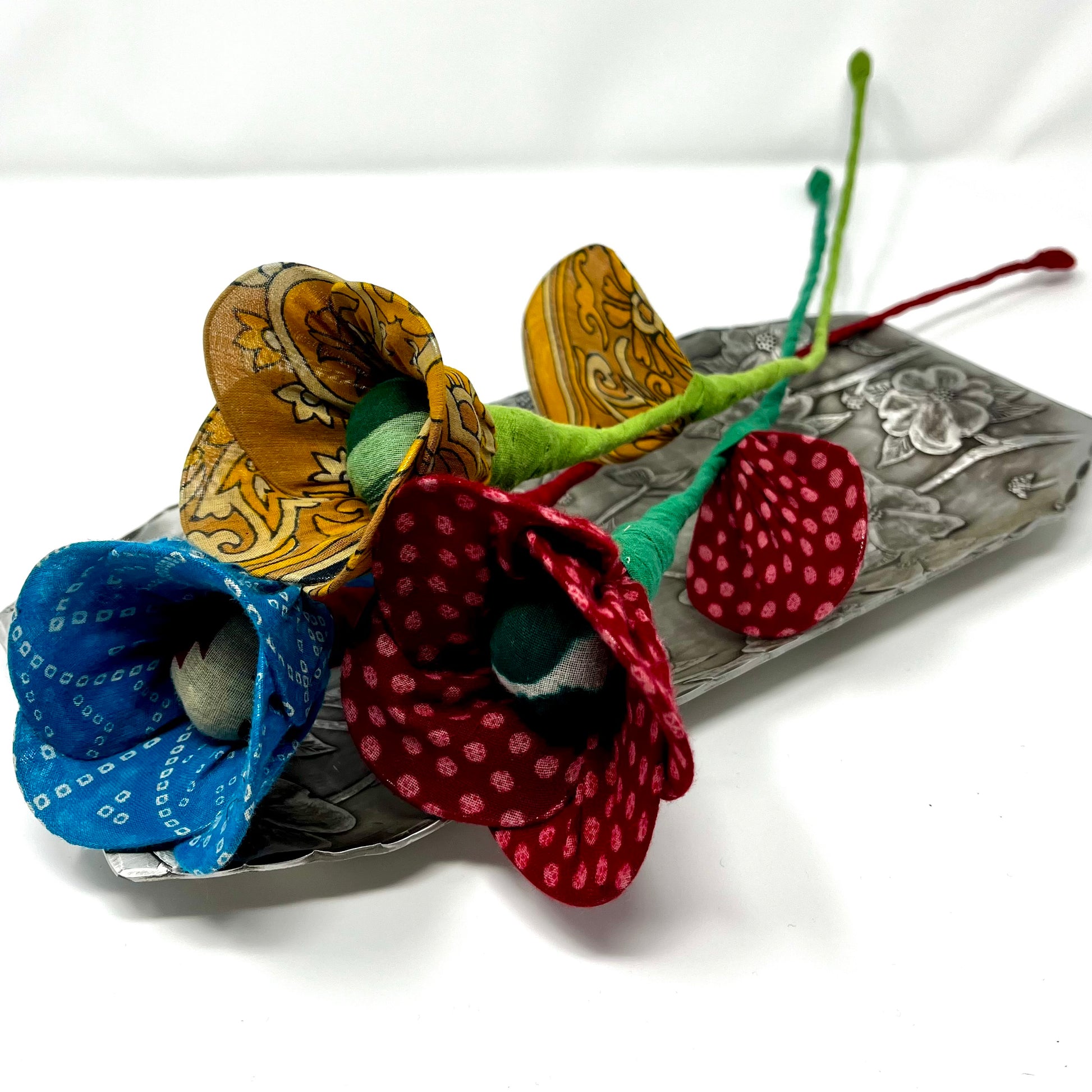 These fun and whimsical flowers are a perfect addition to brighten up any room. Fine sari material finds new life in the creation of this flower from artisan group Hajiganj. Crafted with bendable wire, this flower is easily wrapped or maneuvered into the shape of your choosing. Because each piece of fabric comes from a real recycled sari, no two flowers are entirely alike.