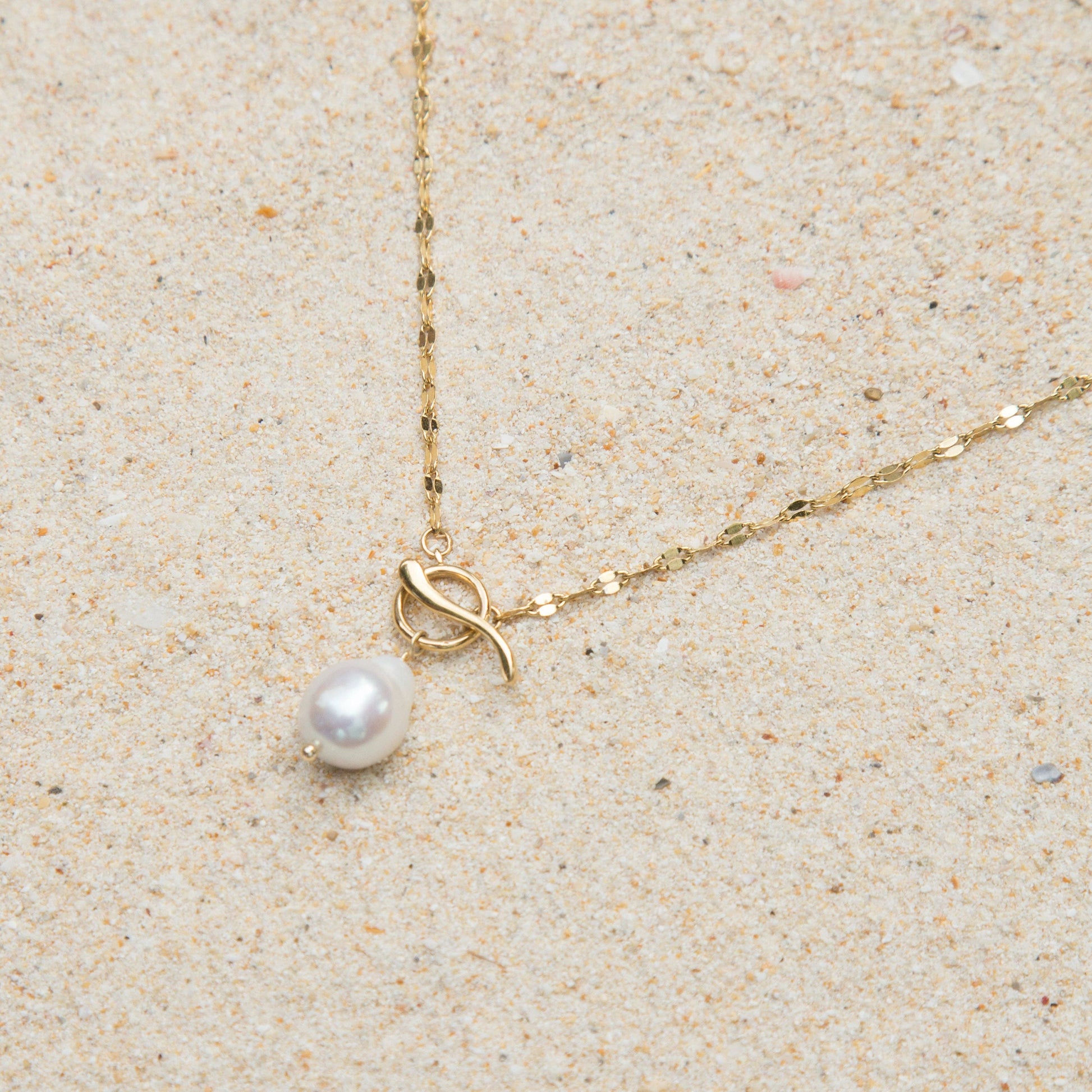 The Walk on Water Pearl Necklace features a stunning 0.6" baroque pearl together with a front clasp and a 22" 18K gold-plated stainless steel lip chain.