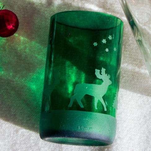 Bring a touch of magic to your winter table with this set of two 12 oz green glasses, each etched with graceful deer and twinkling stars. Handmade in Egypt from upcycled glass bottles, they are perfect for eggnog, sparkling cider, or your favorite festive drink, adding sustainable charm and seasonal cheer to every gathering.